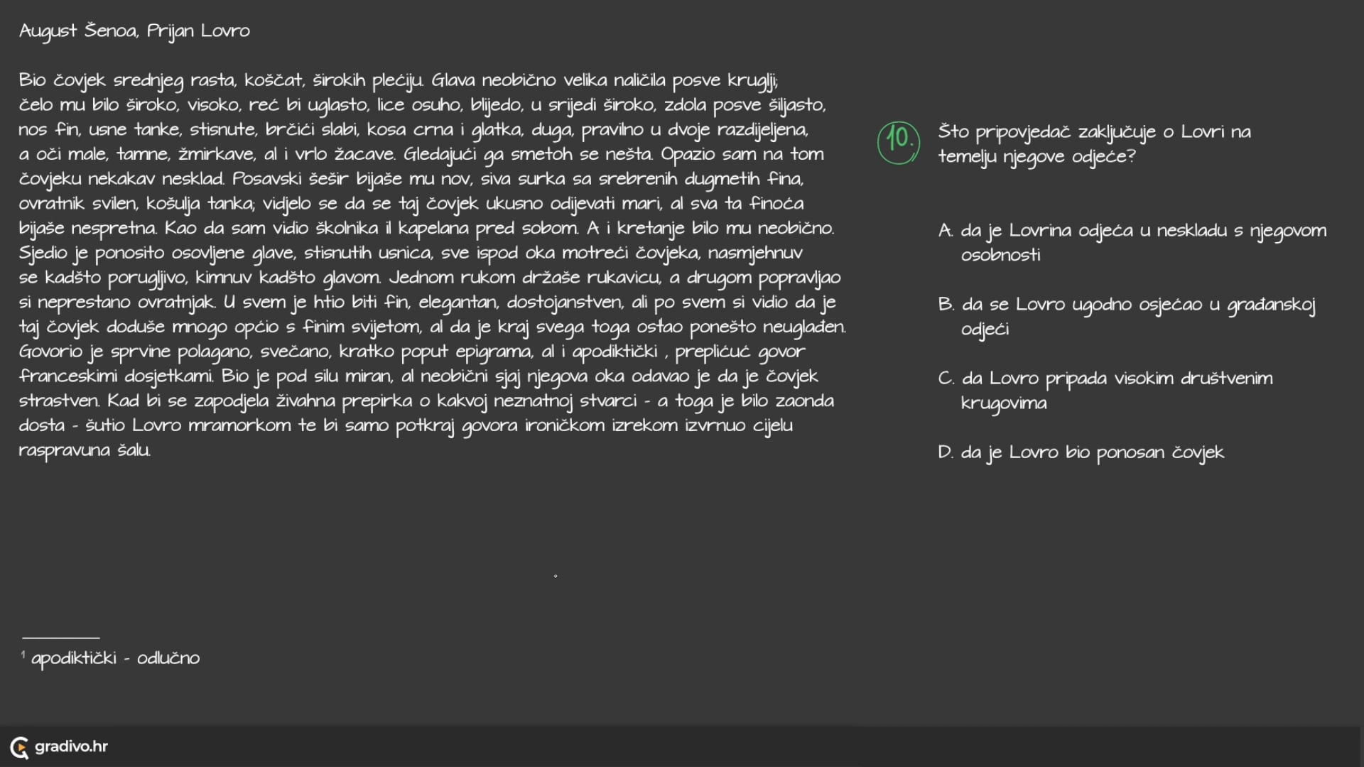 Bio čovjek srednjeg rasta, koščat, širokih plećiju. Glava neobično velika naličila posve kruglij; čelo mu bilo široko, visoko, reć bi uglasto, lice osuho, blijedo, u srijedi široko, zdola posve šiljasto, nos fin, usne tanke, stisnute, brčići slabi, kosa crna i glatka, duga, pravilno u dvoje razdijeljena, a oči male, tamne, žmirkave, al i vrlo žacave. Gledajući ga smetoh se nešta. Opazio sam na tom čovjeku nekakav nesklad. Posavski šešir bijaše mu nov, siva surka sa srebrenih dugmetih fina, ovratnik svilen, košulja tanka; vidjelo se da se taj čovjek ukusno odijevati mari, al sva ta finoća bijaše nespretna. Kao da sam vidio školnika il kapelana pred sobom. A i kretanje bilo mu neobično. Sjedio je ponosito osovljene glave, stisnutih usnica, sve ispod oka motreći čovjeka, nasmjehnuv se kadšto porugljivo, kimnuv kadšto glavom. Jednom rukom držaše rukavicu, a drugom popravljao si neprestano ovratnjak. U svem je htio biti fin, elegantan, dostojanstven, ali po svem si vidio da je taj čovjek doduše mnogo općio s finim svijetom, al da je kraj svega toga ostao ponešto neuglađen. Govorio je sprvine polagano, svečano, kratko poput epigrama, al i apodiktički ${ }^1$, preplićuć govor franceskimi dosjetkami. Bio je pod silu miran, al neobični sjaj njegova oka odavao je da je čovjek strastven. Kad bi se zapodjela živahna prepirka o kakvoj neznatnoj stvarci - a toga je bilo zaonda dosta - šutio Lovro mramorkom te bi samo potkraj govora ironičkom izrekom izvrnuo cijelu raspravu na šalu.