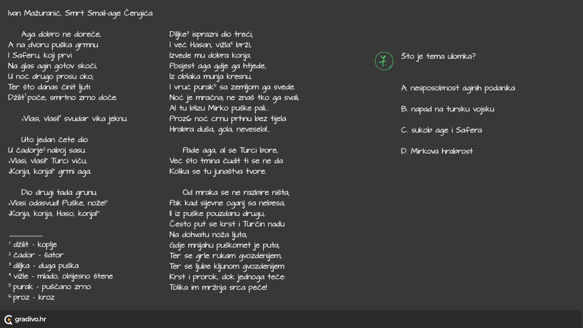 Aga dobro ne doreče, A na dvoru puška grmnu I Saferu, koji prvi Na glas agin gotov skoči, U noć drugo prosu oko; Ter što danas činit ljuti Džilit${ }^1$ poče, smrtno zrno doče. „Vlasi, vlasi!” svudar vika jeknu. Uto jedan čete dio U čadorje${ }^2$ naboj sasu. „Vlasi, vlasi!ˮ Turci viču, „Konja, konja!ˮ grmi aga. Dio drugi tada grunu. „Vlasi odasvud! Puške, nože!ˮ „Konja, konja, Haso, konja!ˮ Diljke${ }^3$ isprazni dio treći; I već Hasan, vižla${ }^4$ brži, Izvede mu dobra konja. Posjest aga gdje ga htjede, Iz oblaka munja kresnu, I vruć purak${ }^5$ sa zemljom ga svede. Noć je mračna; ne znaš tko ga svali, Al tu blizu Mirko puške pali... Proz6 noć crnu prhnu bez tijela Hrabra duša, gola, nevesela!... | Pade aga, al se Turci bore, Već što tmina čudit ti se ne da Kolika se tu junaštva tvore. Od mraka se ne razbire ništa; Pak kad sijevne oganj sa nebesa, Il iz puške pouzdanu drugu, Često put se krst i Turčin nađu Na dohvatu noža ljuta, Gdje mnijahu puškomet je puta; Ter se grle rukam gvozdenijem, Ter se ljube kljunom gvozdenijem Krst i prorok, dok jednoga teče: Tolika im mržnja srca peče! |
