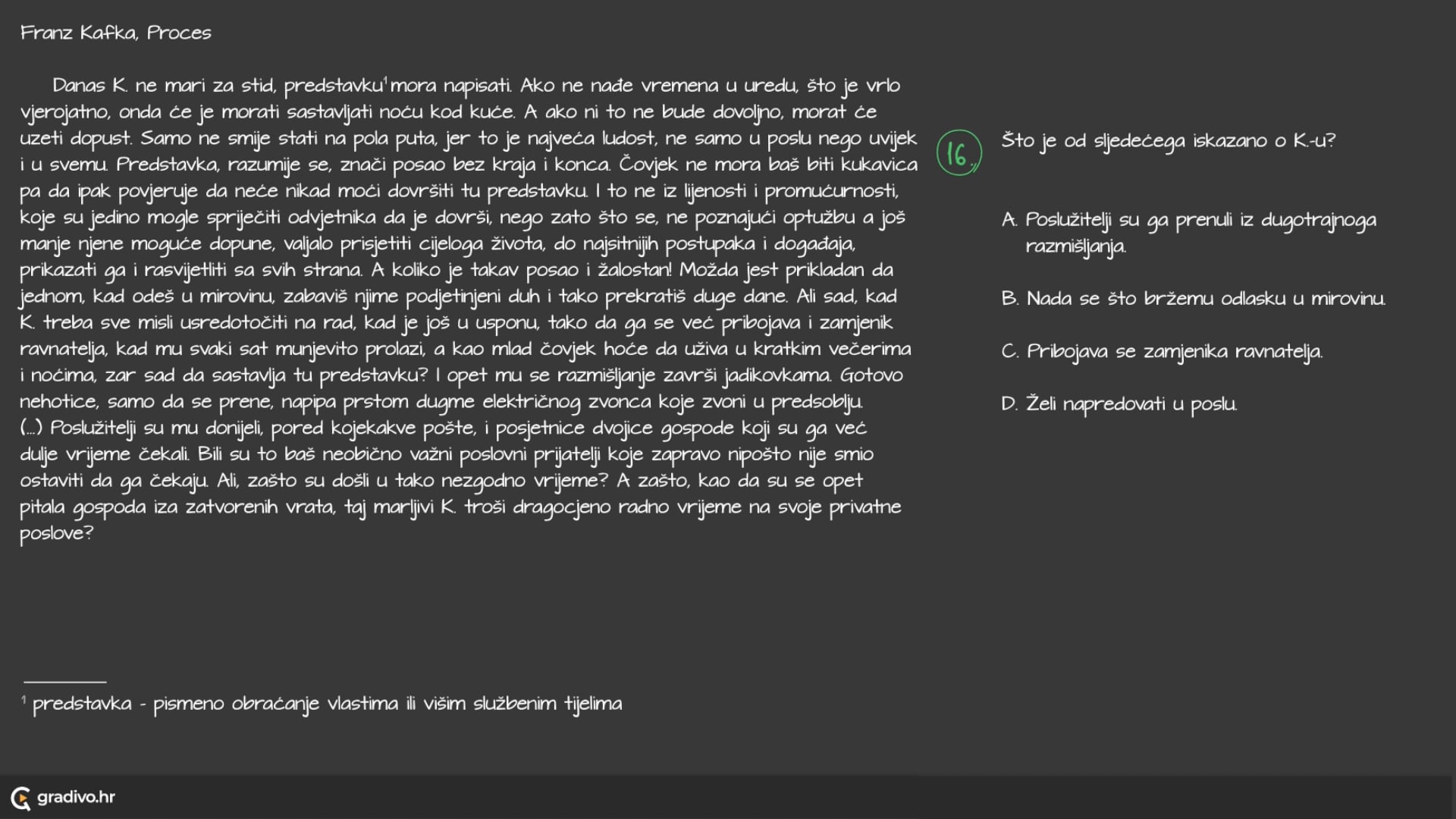 Danas K. ne mari za stid, predstavku${ }^1$ mora napisati. Ako ne nađe vremena u uredu, što je vrlo vjerojatno, onda će je morati sastavljati noću kod kuće. A ako ni to ne bude dovoljno, morat će uzeti dopust. Samo ne smije stati na pola puta, jer to je najveća ludost, ne samo u poslu nego uvijek i u svemu. Predstavka, razumije se, znači posao bez kraja i konca. Čovjek ne mora baš biti kukavica pa da ipak povjeruje da neće nikad moći dovršiti tu predstavku. I to ne iz lijenosti i promućurnosti, koje su jedino mogle spriječiti odvjetnika da je dovrši, nego zato što se, ne poznajući optužbu a još manje njene moguće dopune, valjalo prisjetiti cijeloga života, do najsitnijih postupaka i događaja, prikazati ga i rasvijetliti sa svih strana. A koliko je takav posao i žalostan! Možda jest prikladan da jednom, kad odeš u mirovinu, zabaviš njime podjetinjeni duh i tako prekratiš duge dane. Ali sad, kad K. treba sve misli usredotočiti na rad, kad je još u usponu, tako da ga se već pribojava i zamjenik ravnatelja, kad mu svaki sat munjevito prolazi, a kao mlad čovjek hoće da uživa u kratkim večerima i noćima, zar sad da sastavlja tu predstavku? I opet mu se razmišljanje završi jadikovkama. Gotovo nehotice, samo da se prene, napipa prstom dugme električnog zvonca koje zvoni u predsoblju. (...) Poslužitelji su mu donijeli, pored kojekakve pošte, i posjetnice dvojice gospode koji su ga već dulje vrijeme čekali. Bili su to baš neobično važni poslovni prijatelji koje zapravo nipošto nije smio ostaviti da ga čekaju. Ali, zašto su došli u tako nezgodno vrijeme? A zašto, kao da su se opet pitala gospoda iza zatvorenih vrata, taj marljivi K. troši dragocjeno radno vrijeme na svoje privatne poslove?