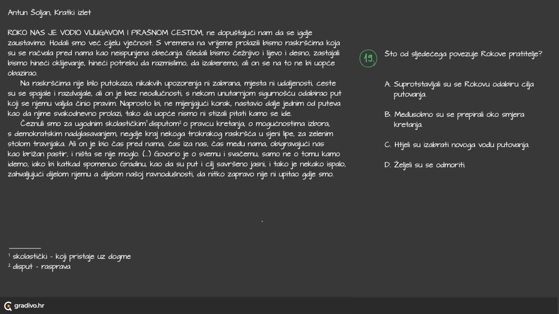 Čeznuli smo za ugodnim skolastičkim ${ }^1$ disputom ${ }^2$ o pravcu kretanja, o mogućnostima izbora, s demokratskim nadglasavanjem, negdje kraj nekoga trokrakog raskršća u sjeni lipe, za zelenim stolom travnjaka. Ali on je bio čas pred nama, čas iza nas, čas među nama, obigravajući nas kao brižan pastir, i ništa se nije moglo. (...) Govorio je o svemu i svačemu, samo ne o tomu kamo idemo, iako bi katkad spomenuo Gradinu, kao da su put i cilj savršeno jasni, i tako je nekako ispalo, zahvaljujući dijelom njemu a dijelom našoj ravnodušnosti, da nitko zapravo nije ni upitao gdje smo.