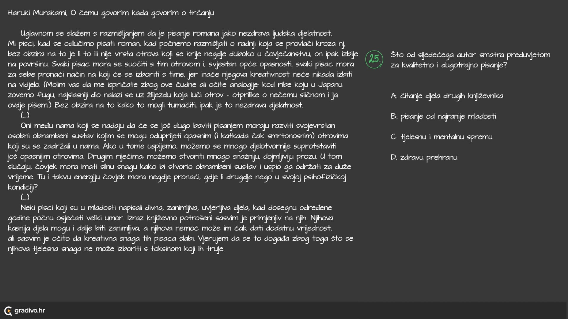 Oni među nama koji se nadaju da će se još dugo baviti pisanjem moraju razviti svojevrstan osobni obrambeni sustav kojim se mogu oduprijeti opasnim (i katkada čak smrtonosnim) otrovima koji su se zadržali u nama. Ako u tome uspijemo, možemo se mnogo djelotvornije suprotstaviti još opasnijim otrovima. Drugim riječima: možemo stvoriti mnogo snažniju, dojmljiviju prozu. U tom slučaju, čovjek mora imati silnu snagu kako bi stvorio obrambeni sustav i uspio ga održati za duže vrijeme. Tu i takvu energiju čovjek mora negdje pronaći, gdje li drugdje nego u svojoj psihofizičkoj kondiciji?