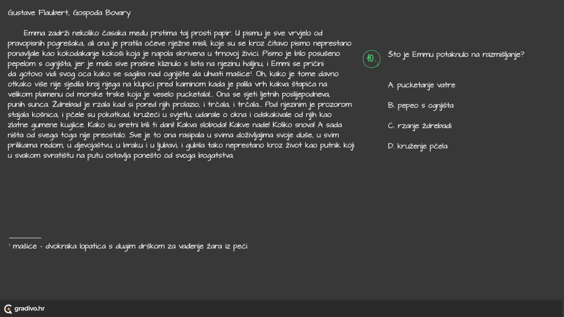 Emma zadrži nekoliko časaka među prstima taj prosti papir. U pismu je sve vrvjelo od pravopisnih pogrešaka, ali ona je pratila očeve nježne misli, koje su se kroz čitavo pismo neprestano ponavljale kao kokodakanje kokoši koja je napola skrivena u trnovoj živici. Pismo je bilo posušeno pepelom s ognjišta, jer je malo sive prašine kliznulo s lista na njezinu haljinu, i Emmi se prič ini da gotovo vidi svog oca kako se sagiba nad ognjište da uhvati mašice ${ }^1$. Oh, kako je tome davno otkako više nije sjedila kraj njega na klupici pred kaminom kada je palila vrh kakva štapića na velikom plamenu od morske trske koja je veselo pucketala!... Ona se sjeti ljetnih poslijepodneva, punih sunca. Ždrebad je rzala kad si pored njih prolazio, i trčala, i trčala... Pod njezinim je prozorom stajala košnica, i pčele su pokatkad, kružeći u svjetlu, udarale o okna i odskakivale od njih kao zlatne gumene kuglice. Kako su sretni bili ti dani! Kakva sloboda! Kakve nade! Koliko snova! A sada ništa od svega toga nije preostalo. Sve je to ona rasipala u svima doživljajima svoje duše, u svim prilikama redom, u djevojaštvu, u braku i u ljubavi, i gubila tako neprestano kroz život kao putnik koji u svakom svratištu na putu ostavlja ponešto od svoga bogatstva.