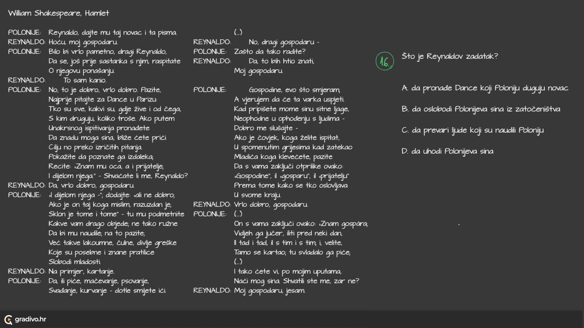 POLONIJE: | (...) On s vama zaključi ovako: „Znam gospára; Vidjeh ga jučer, iliti pred neki dan, Il tad i tad, il s tim i s tim; i, velite, Tamo se kartao; tu svladalo ga piće; (...) I tako ćete vi, po mojim uputama, Naći mog sina. Shvatili ste me, zar ne? |