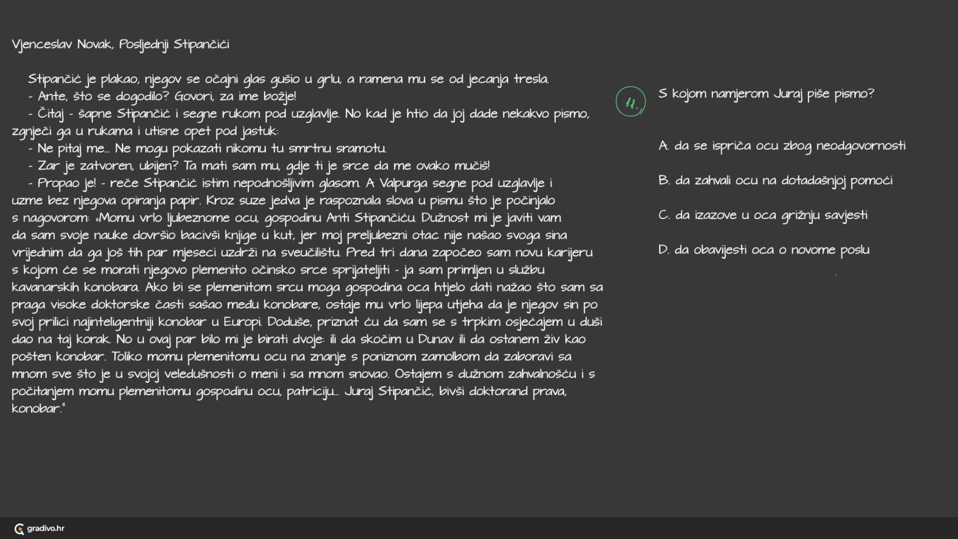 - Propao je! - reče Stipančić istim nepodnošljivim glasom. A Valpurga segne pod uzglavlje i uzme bez njegova opiranja papir. Kroz suze jedva je raspoznala slova u pismu što je počinjalo s nagovorom: „Momu vrlo ljubeznome ocu, gospodinu Anti Stipančiću. Dužnost mi je javiti vam da sam svoje nauke dovršio bacivši knjige u kut, jer moj preljubezni otac nije našao svoga sina vrijednim da ga još tih par mjeseci uzdrži na sveučilištu. Pred tri dana započeo sam novu karijeru s kojom će se morati njegovo plemenito očinsko srce sprijateljiti - ja sam primljen u službu kavanarskih konobara. Ako bi se plemenitom srcu moga gospodina oca htjelo dati nažao što sam sa praga visoke doktorske časti sašao među konobare, ostaje mu vrlo lijepa utjeha da je njegov sin po svoj prilici najinteligentniji konobar u Europi. Doduše, priznat ću da sam se s trpkim osjećajem u duši dao na taj korak. No u ovaj par bilo mi je birati dvoje: ili da skočim u Dunav ili da ostanem živ kao pošten konobar. Toliko momu plemenitomu ocu na znanje s poniznom zamolbom da zaboravi sa mnom sve što je u svojoj veledušnosti o meni i sa mnom snovao. Ostajem s dužnom zahvalnošću i s počitanjem momu plemenitomu gospodinu ocu, patriciju... Juraj Stipančić, bivši doktorand prava, konobar."