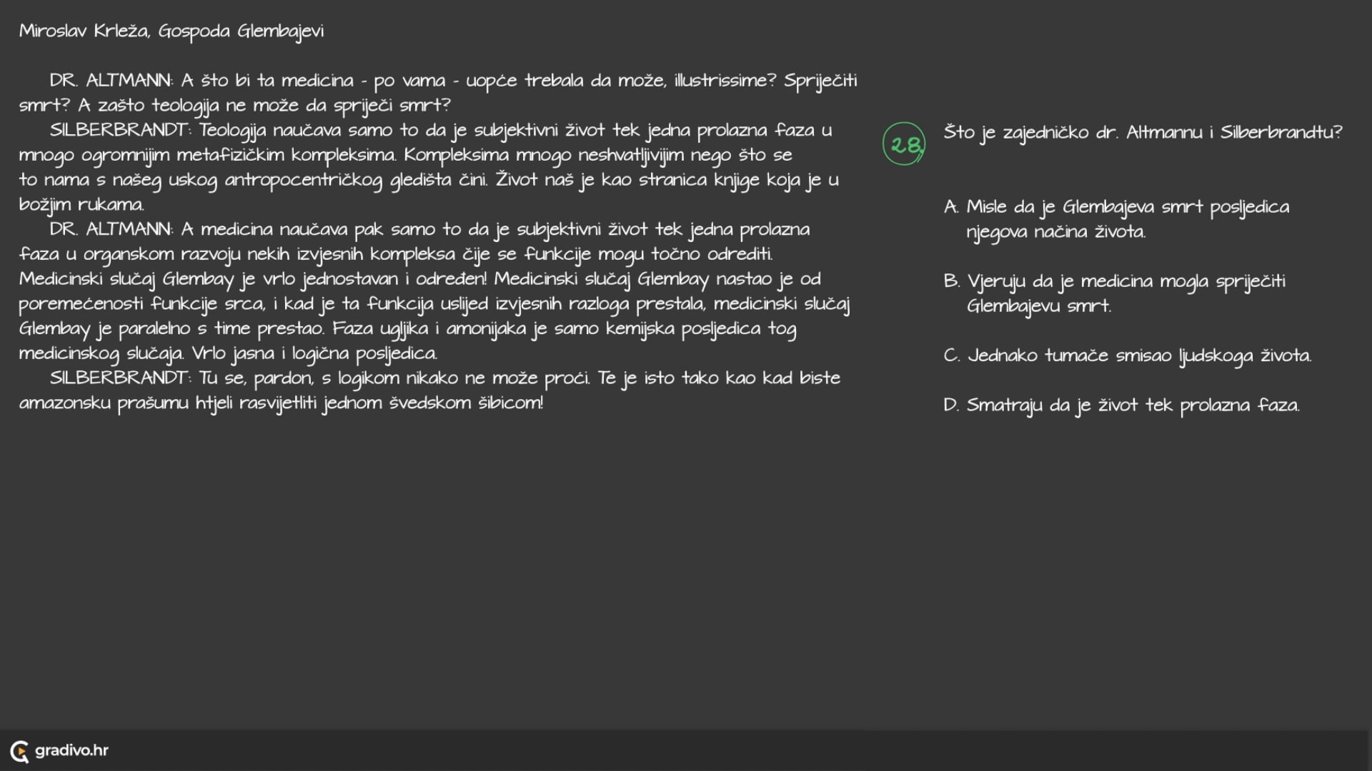 DR. ALTMANN: A medicina naučava pak samo to da je subjektivni život tek jedna prolazna faza u organskom razvoju nekih izvjesnih kompleksa čije se funkcije mogu točno odrediti. Medicinski slučaj Glembay je vrlo jednostavan i određen! Medicinski slučaj Glembay nastao je od poremećenosti funkcije srca, i kad je ta funkcija uslijed izvjesnih razloga prestala, medicinski slučaj Glembay je paralelno s time prestao. Faza ugljika i amonijaka je samo kemijska posljedica tog medicinskog slučaja. Vrlo jasna i logična posljedica.