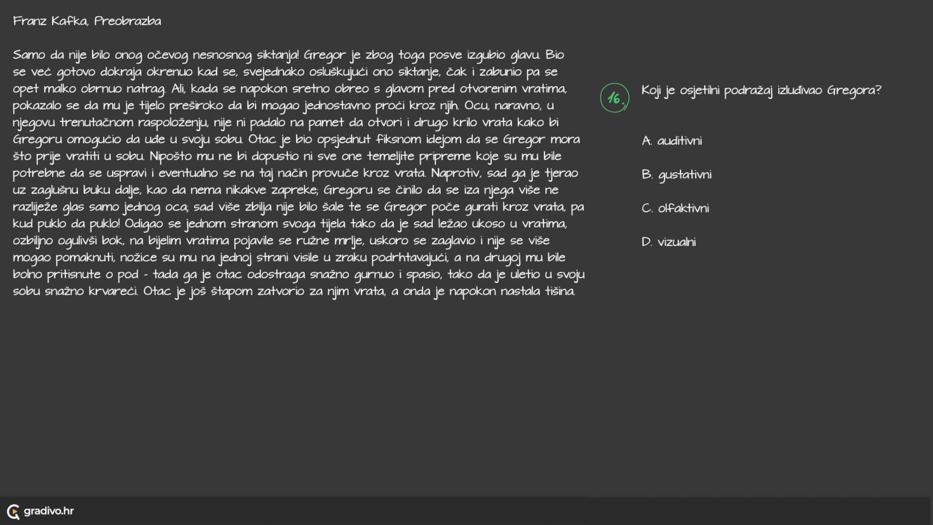 Samo da nije bilo onog očevog nesnosnog siktanja! Gregor je zbog toga posve izgubio glavu. Bio se već gotovo dokraja okrenuo kad se, svejednako osluškujući ono siktanje, čak i zabunio pa se opet malko obrnuo natrag. Ali, kada se napokon sretno obreo s glavom pred otvorenim vratima, pokazalo se da mu je tijelo preširoko da bi mogao jednostavno proći kroz njih. Ocu, naravno, u njegovu trenutačnom raspoloženju, nije ni padalo na pamet da otvori i drugo krilo vrata kako bi Gregoru omogućio da uđe u svoju sobu. Otac je bio opsjednut fiksnom idejom da se Gregor mora što prije vratiti u sobu. Nipošto mu ne bi dopustio ni sve one temeljite pripreme koje su mu bile potrebne da se uspravi i eventualno se na taj način provuče kroz vrata. Naprotiv, sad ga je tjerao uz zaglušnu buku dalje, kao da nema nikakve zapreke; Gregoru se činilo da se iza njega više ne razliježe glas samo jednog oca; sad više zbilja nije bilo šale te se Gregor poče gurati kroz vrata, pa kud puklo da puklo! Odigao se jednom stranom svoga tijela tako da je sad ležao ukoso u vratima, ozbiljno ogulivši bok, na bijelim vratima pojavile se ružne mrlje, uskoro se zaglavio i nije se više mogao pomaknuti, nožice su mu na jednoj strani visile u zraku podrhtavajući, a na drugoj mu bile bolno pritisnute o pod - tada ga je otac odostraga snažno gurnuo i spasio, tako da je uletio u svoju sobu snažno krvareći. Otac je još štapom zatvorio za njim vrata, a onda je napokon nastala tišina.