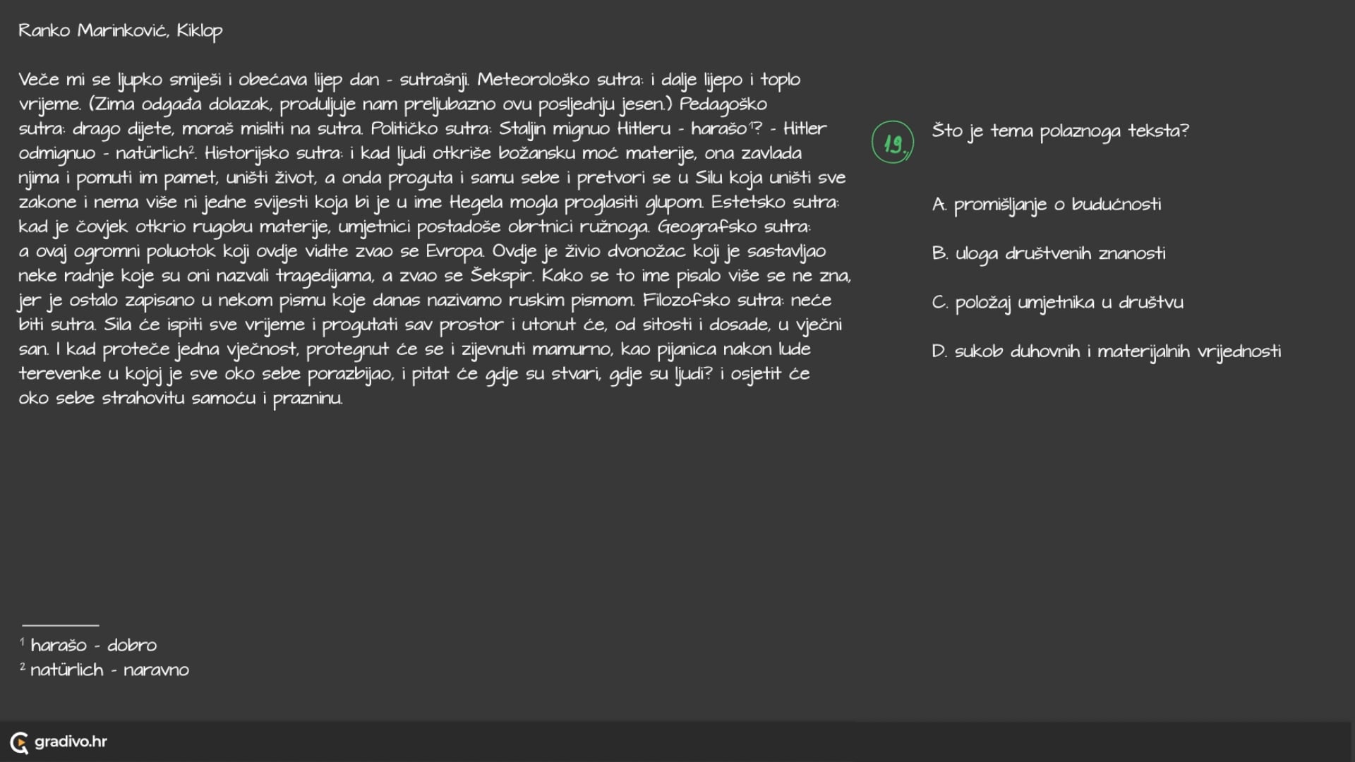 Veče mi se ljupko smiješi i obećava lijep dan - sutrašnji. Meteorološko sutra: i dalje lijepo i toplo vrijeme. (Zima odgađa dolazak, produljuje nam preljubazno ovu posljednju jesen.) Pedagoško sutra: drago dijete, moraš misliti na sutra. Političko sutra: Staljin mignuo Hitleru - harašo1? - Hitler odmignuo - natürlich2. Historijsko sutra: i kad ljudi otkriše božansku moć materije, ona zavlada njima i pomuti im pamet, uništi život, a onda proguta i samu sebe i pretvori se u Silu koja uništi sve zakone i nema više ni jedne svijesti koja bi je u ime Hegela mogla proglasiti glupom. Estetsko sutra: kad je čovjek otkrio rugobu materije, umjetnici postadoše obrtnici ružnoga. Geografsko sutra: a ovaj ogromni poluotok koji ovdje vidite zvao se Evropa. Ovdje je živio dvonožac koji je sastavljao neke radnje koje su oni nazvali tragedijama, a zvao se Šekspir. Kako se to ime pisalo više se ne zna, jer je ostalo zapisano u nekom pismu koje danas nazivamo ruskim pismom. Filozofsko sutra: neće biti sutra. Sila će ispiti sve vrijeme i progutati sav prostor i utonut će, od sitosti i dosade, u vječni san. I kad proteče jedna vječnost, protegnut će se i zijevnuti mamurno, kao pijanica nakon lude terevenke u kojoj je sve oko sebe porazbijao, i pitat će gdje su stvari, gdje su ljudi? i osjetit će oko sebe strahovitu samoću i prazninu.