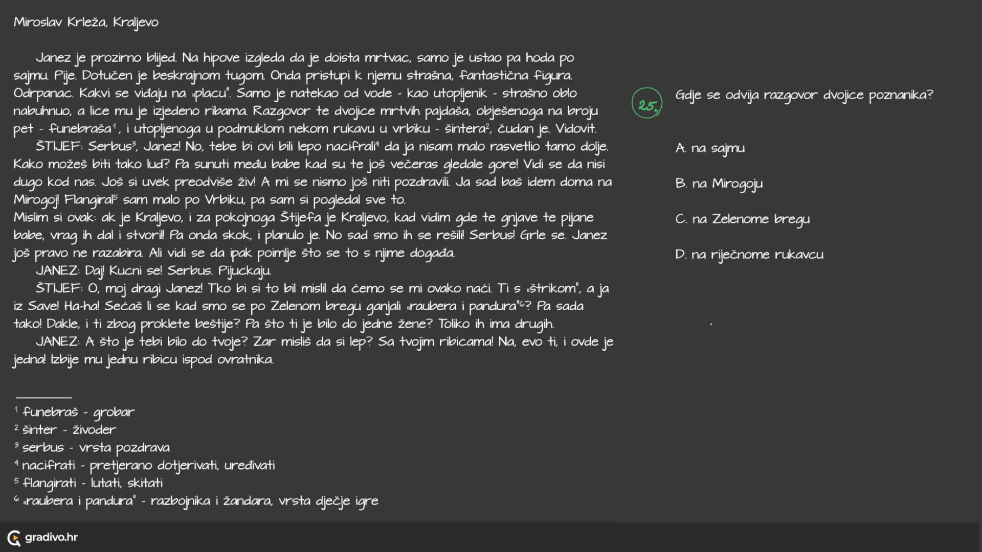 Janez je prozirno blijed. Na hipove izgleda da je doista mrtvac, samo je ustao pa hoda po sajmu. Pije. Dotučen je beskrajnom tugom. Onda pristupi k njemu strašna, fantastična figura. Odrpanac. Kakvi se viđaju na „placu". Samo je natekao od vode - kao utopljenik - strašno oblo nabuhnuo, a lice mu je izjedeno ribama. Razgovor te dvojice mrtvih pajdaša, obješenoga na broju pet - funebraša1, i utopljenoga u podmuklom nekom rukavu u vrbiku - šintera2, čudan je. Vidovit.