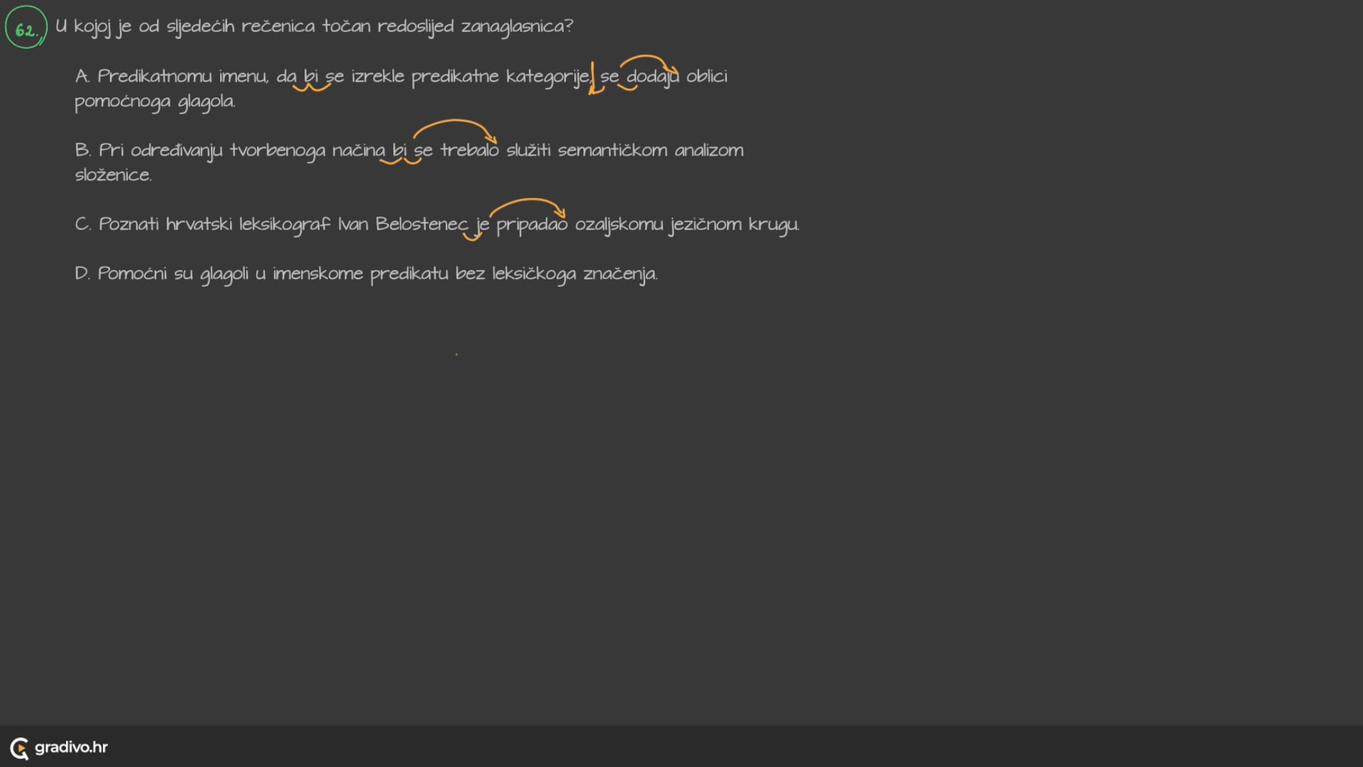 A. Predikatnomu imenu, da bi se izrekle predikatne kategorije, se dodaju oblici pomoćnoga glagola.