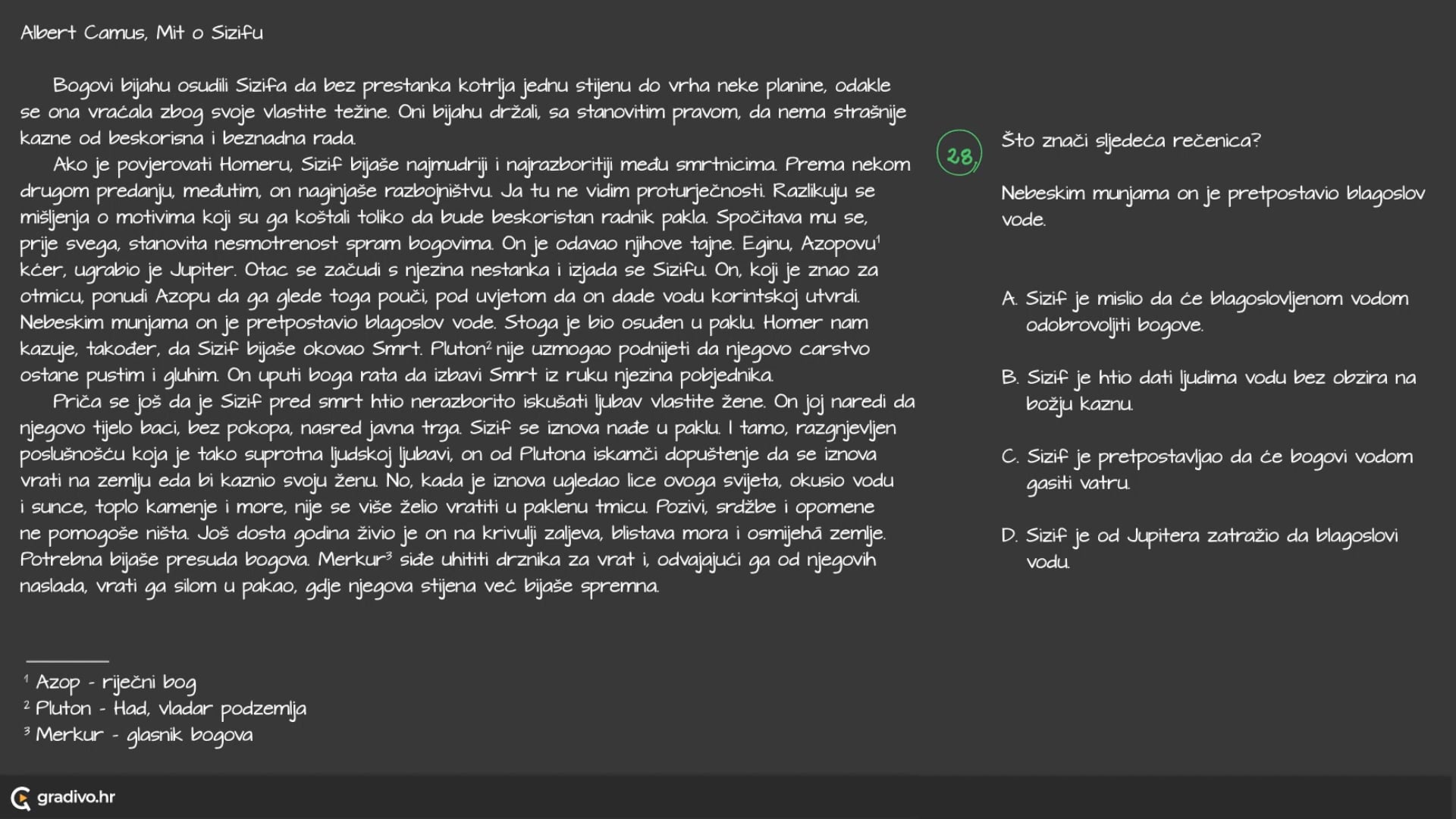 Ako je povjerovati Homeru, Sizif bijaše najmudriji i najrazboritiji među smrtnicima. Prema nekom drugom predanju, međutim, on naginjaše razbojništvu. Ja tu ne vidim proturječnosti. Razlikuju se mišljenja o motivima koji su ga koštali toliko da bude beskoristan radnik pakla. Spočitava mu se, prije svega, stanovita nesmotrenost spram bogovima. On je odavao njihove tajne. Eginu, Azopovu¹ kćer, ugrabio je Jupiter. Otac se začudi s njezina nestanka i izjada se Sizifu. On, koji je znao za otmicu, ponudi Azopu da ga glede toga pouči, pod uvjetom da on dade vodu korintskoj utvrdi. Nebeskim munjama on je pretpostavio blagoslov vode. Stoga je bio osuđen u paklu. Homer nam kazuje, također, da Sizif bijaše okovao Smrt. Pluton ${ }^2$ nije uzmogao podnijeti da njegovo carstvo ostane pustim i gluhim. On uputi boga rata da izbavi Smrt iz ruku njezina pobjednika.