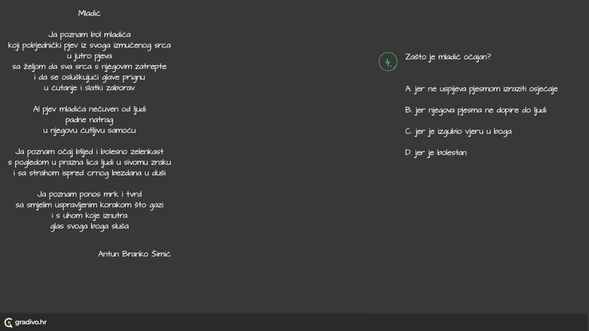 Ja poznam bol mladića koji pobjednički pjev iz svoga izmučenog srca u jutro pjeva sa željom da sva srca s njegovim zatrepte i da se osluškujući glave prignu u ćutanje i slatki zaborav