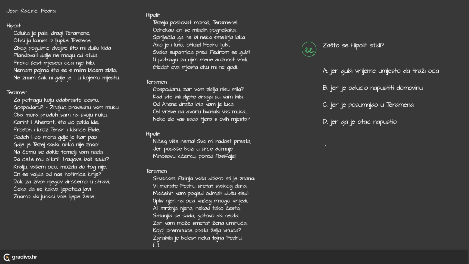 Hipolit Odluka je pala, dragi Teramene, Otići ja kanim iz ljupke Trezene. Zbog pogubne dvojbe što mi dušu kida Plandovati dalje ne mogu od stida. Preko šest mjeseci oca nije bilo, Nemam pojma što se s milim bićem zbilo, Ne znam čak ni gdje je – u kojemu mjestu. Teramen Za potragu koju odabraste cestu, Gospodaru? – Znajuć pravednu vam muku Oba mora prođoh sam na svoju ruku, Korint i Aheront, što do pakla ide, Prođoh i kroz Tenar i klance Elide. Dođoh i do mora gdje je Ikar pao: Gdje je Tezej sada, nitko nije znao! Na čemu se dakle temelji vam nada Da ćete mu otkrit tragove baš sada? Kralju, vašem ocu, možda do tog nije, On se valjda od nas hotimice krije? Dok za život njegov dršćemo u stravi, Čeka da se kakva ljepotica javi: Znamo da junaci vole lijepe žene... Hipolit Tezeja poštovat moraš, Teramene! Odrekao on se mladih pogrešaka, Spriječila ga ne bi neka smetnja laka. Ako je i luto, otkad Fedru ljubi, Svaka suparnica pred Fedrom se gubi! U potragu za njim mene dužnost vodi, Gledat ova mjesta oku mi ne godi. | Teramen Gospodaru, zar vam zbilja nisu mila? Kad ste bili dijete draga su vam bila. Od Atene draža bila vam je luka Od vreve na dvoru hvatala vas muka... Neko zlo vas sada tjera s ovih mjesta? Hipolit Ničeg više nema! Sva mi radost presta, Jer poslaše bozi u srce domaje Minosovu kćerku, porod Pasifaje! Teramen Shvaćam. Patnja vaša dobro mi je znana: Vi morate Fedru sretat svakog dana, Maćehin vam pogled odmah dušu sledi Upliv njen na oca vašeg mnogo vrijedi. Ali mržnja njena, nekad tako česta, Smanjila se sada, gotovo da nesta. Zar vam može smetat žena umiruća, Kojoj preminuće posta želja vruća? Zgrabila je bolest neka tajna Fedru, (...). |