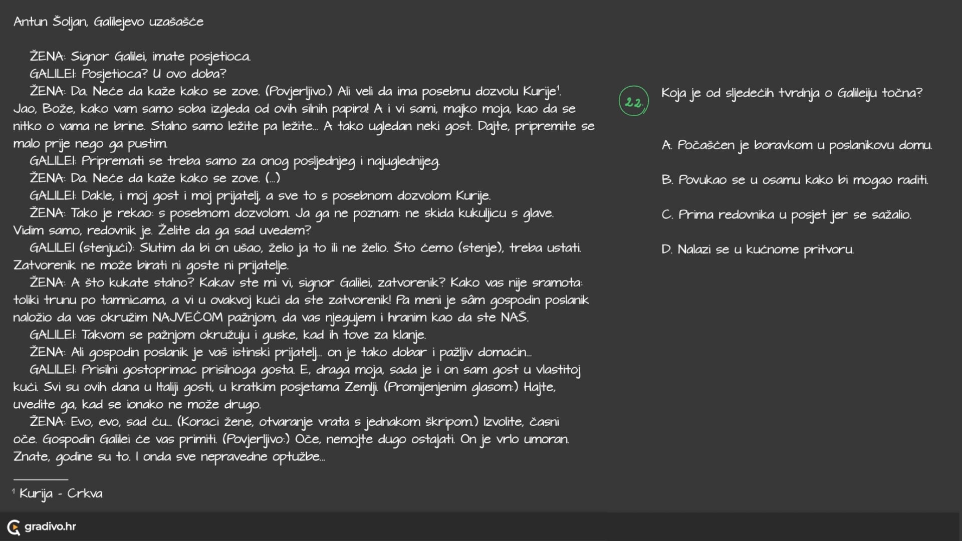 GALILEI (stenjući): Slutim da bi on ušao, żelio ja to ili ne želio. Što ćemo (stenje), treba ustati. Zatvorenik ne može birati ni goste ni prijatelje.