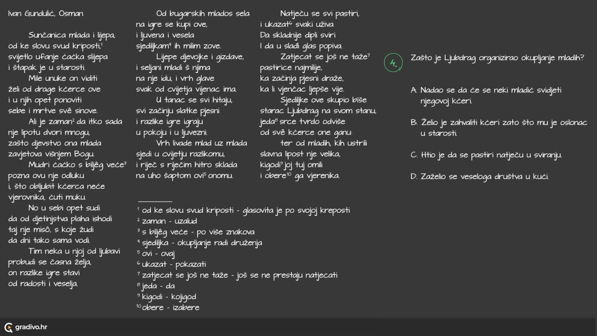 Sunčanica mlada i lijepa, od ke slovu svud kriposti, ${ }^1$ svijetlo ufanje ćaćka slijepa i štapak je u starosti. Mile unuke on viditi želi od drage kćerce ove i u njih opet ponoviti sebe i mrtve svê sinove. Ali je zaman ${ }^2$ da itko sada nje lipotu dvori mnogu, zašto djevstvo ona mlada zavjetova višnjem Bogu. Mudri ćaćko s biljêg veće ${ }^3$ pozna ovu nje odluku i, što obljubit kćerca neće vjerovnika, ćuti muku. No u sebi opet sudi da od djetinjstva plaha ishodi taj nje misô, s koje žudi da dni tako sama vodi. Tim neka u njoj od ljubavi probudi se časna želja, on razlike igre stavi od radosti i veselja. Od bugarskih mlados sela na igre se kupi ove, i ljuvena i vesela sjediljkam ${ }^4$ ih milim zove. | Lijepe djevojke i gizdave, i seljani mladi š njima na nje idu, i vrh glave svak od cvijetja vijenac ima. U tanac se svi hitaju, svi začinju slatke pjesni i razlike igre igraju u pokoju i u ljuvezni. Vrh livade mlad uz mlada sjedi u cvijetju razlikomu, i riječ s riječim hitro sklada na uho šaptom ovi ${ }^5$ onomu. Natječu se svi pastiri, i ukazat ${ }^6$ svaki uživa Da skladnije dipli sviri I da u slađi glas popiva. Zatjecat se još ne taže ${ }^7$ pastirice najmilije, ka začinja pjesni draže, ka li vjenčac ljepše vije. Sjediljke ove skupio bîše starac Ljubdrag na svom stanu, jeda ${ }^8$ srce tvrdo odviše od svê kćerce one ganu: ter od mladih, kih ustrili slavna lipost nje velika, kigodi ${ }^{9}$ joj tuj omili i obere ${ }^{10}$ ga vjerenika. |