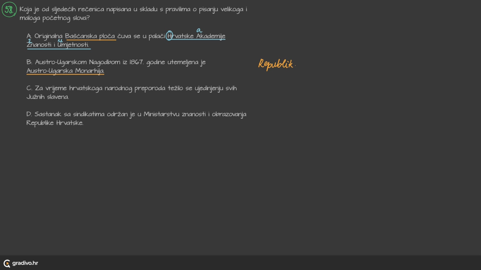 - imena službenih dokumenata, zakona, propisa, pravilnika, nagrada: Deklaracija o nazivu i položaju hrvatskoga književnog jezika, Zakon o radu, Ustav Republike Hrvatske, Zlatni studio
