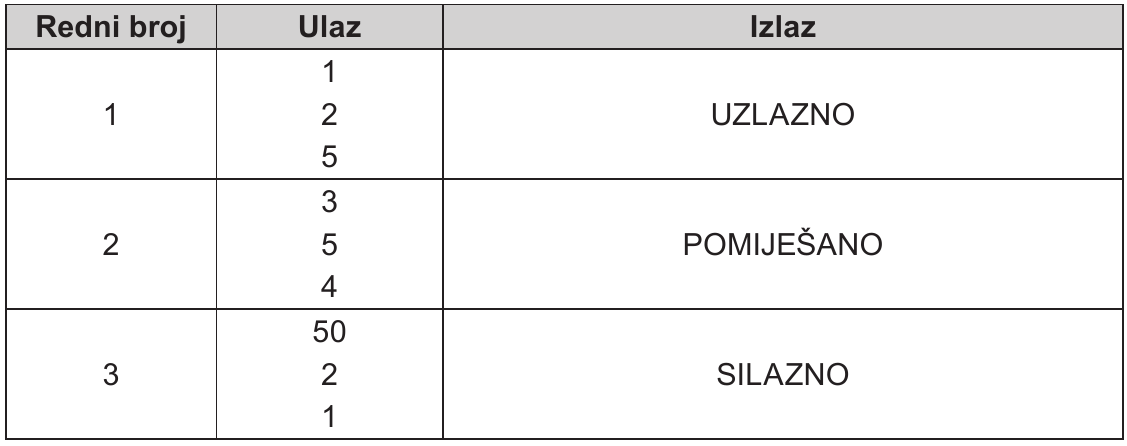 Napišite program koji će učitati tri različita prirodna broja (a, b i c). Program treba ispisati UZLAZNO ako su brojevi učitani na način da je prvo unesen najmanji, zatim srednji, a potom najveći broj, SILAZNO ako je prvo unesen najveći, zatim srednji i na kraju najmanji broj te POMIJEŠANO ako brojevi nisu uneseni niti jednim od spomenutih načina.