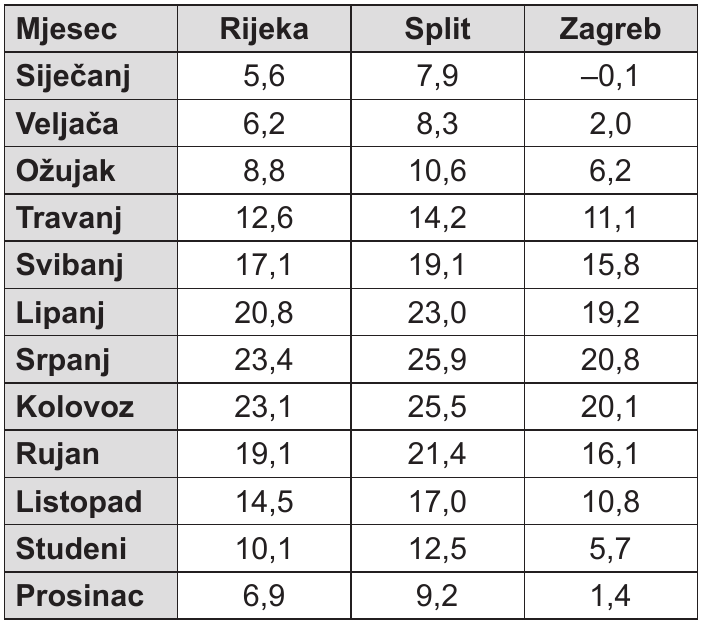 16. U tablici su prikazani podatci o temperaturama u Rijeci, Splitu i Zagrebu po mjesecima.