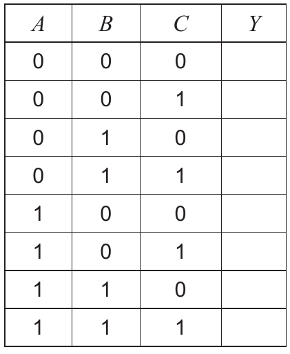 Odredite tablicu istinitosti za složeni logički izraz $Y=\bar{A}+\overline{B+\bar{C} \cdot A} \cdot C$.