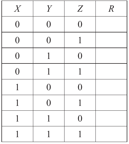 20. Odredite tablicu istinitosti za složeni logički izraz $R=\bar{X}+\bar{Y}+\overline{X \cdot Z+Y}$.
