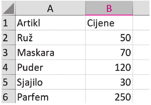navedeni su nazivi artikala, a u stupcu