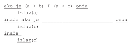 Što treba napisati na praznu crtu kako bi zadani dio programa ispisao najveći od triju različitih brojeva