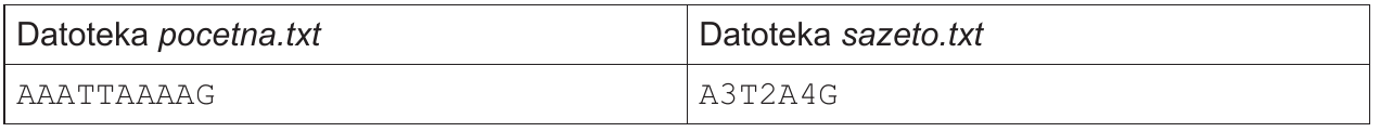 Sadržaj te datoteke sažet ćemo (komprimirati) tako da umjesto svakoga uzastopnog pojavljivanja nekoga slova u datoteci pocetna.txt upišemo to slovo i broj uzastopnoga pojavljivanja toga slova u datoteku sazeto.txt. Ako se slovo ne pojavljuje uzastopno, već samo jednom, iza njega nećemo pisati broj 1.