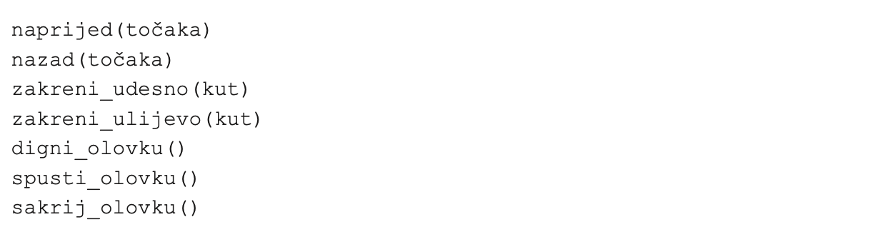 Na početku je olovka u sredini ekrana, spuštena i okrenuta udesno. Kut se zadaje u stupnjevima. Nakon crtanja olovka ne smije biti vidljiva.