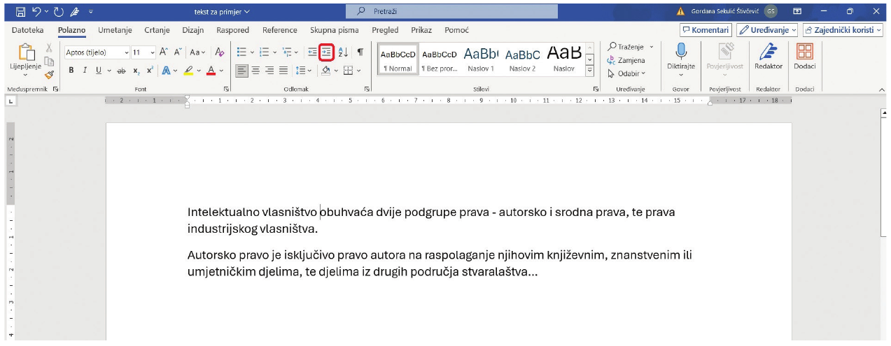 U programu za obradu teksta Word točka umetanja nalazi se na nekome mjestu u dokumentu. Ako kliknemo na ikonu ${ }^{\underline{\underline{\underline{=}}}}$ kao na prikazanoj slici, tekst će se približiti margini. Na koji će dio dokumenta djelovati naredba?