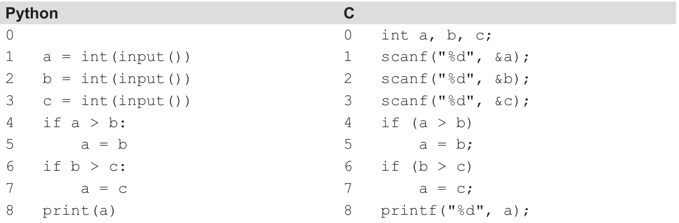Zadani dio programa trebao bi ispisati najmanju od triju učitanih vrijednosti, no u programu je pogreška.