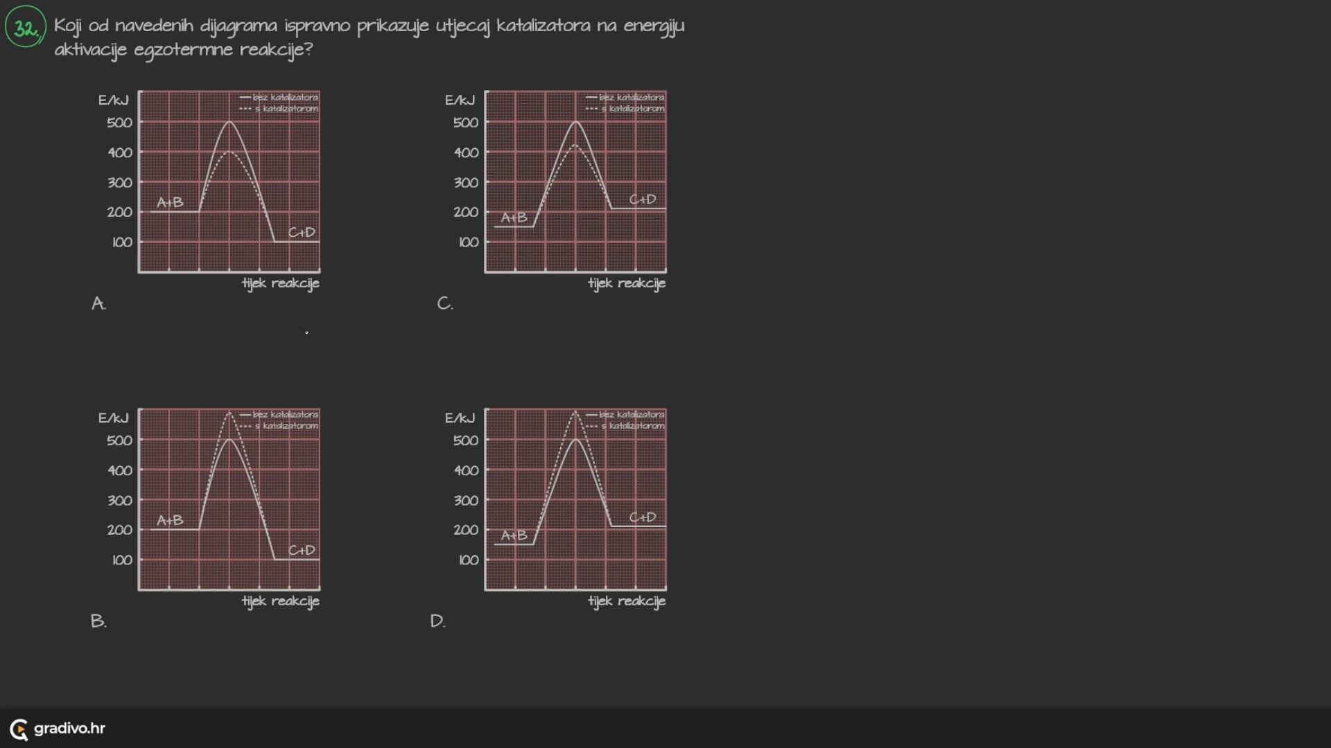 Koji od navedenih dijagrama ispravno prikazuje utjecaj katalizatora na energiju aktivacije egzotermne reakcije?