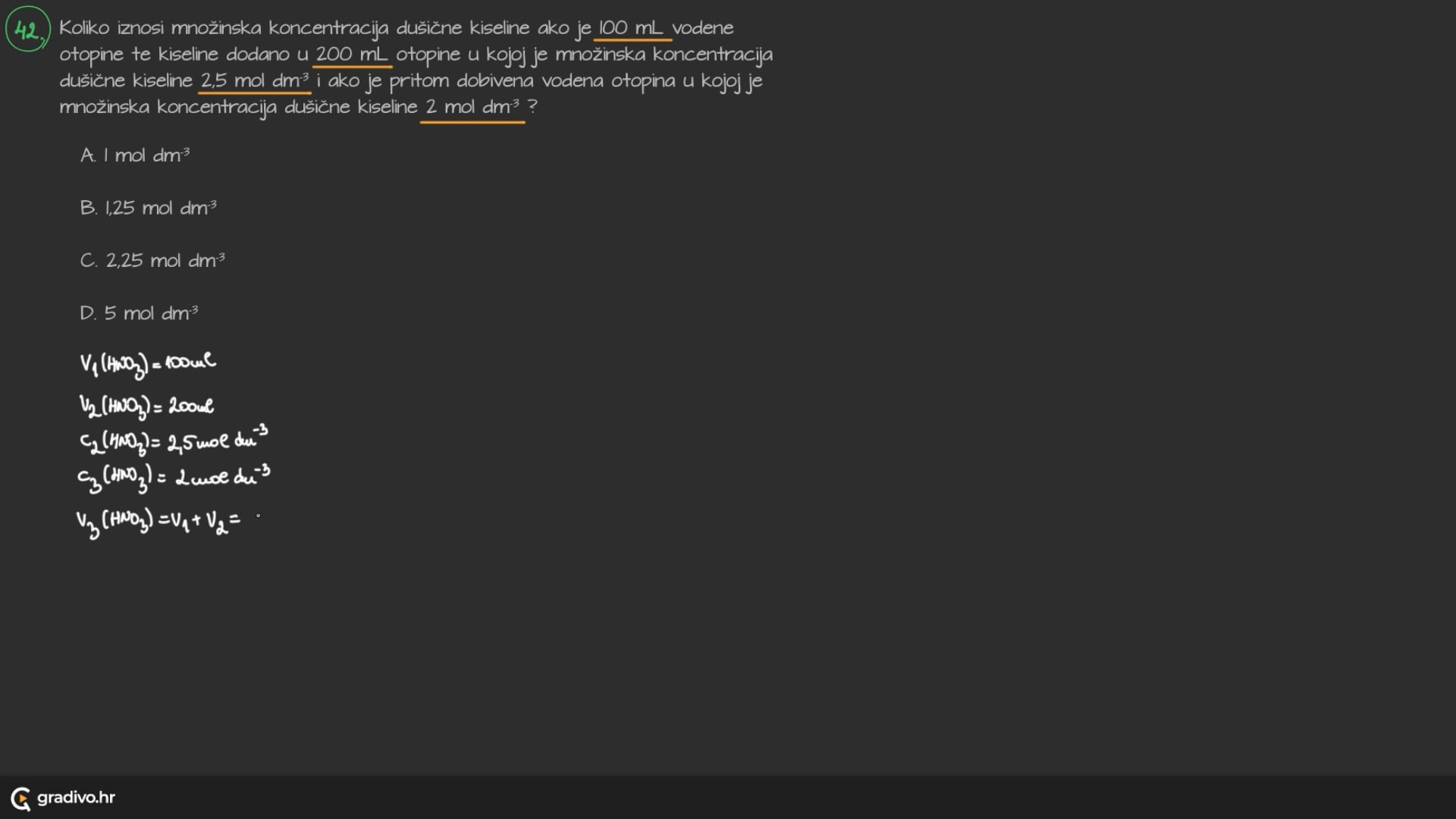 Koliko iznosi množinska koncentracija dušične kiseline ako je 100 mL vodene otopine te kiseline dodano u 200 mL otopine u kojoj je množinska koncentracija dušične kiseline 2,5moldm−3 i ako je pritom dobivena vodena otopina u kojoj je množinska koncentracija dušične kiseline 2moldm−3 ?