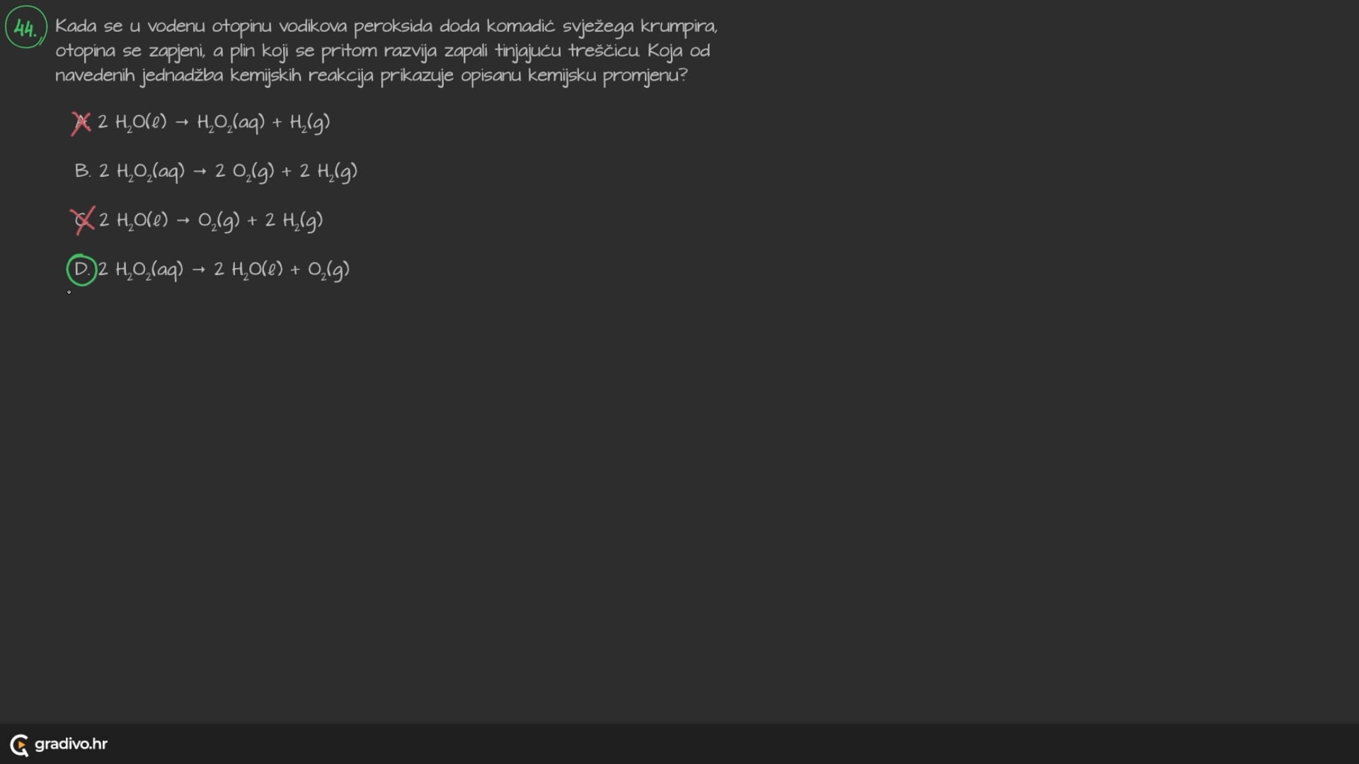 Kada se u vodenu otopinu vodikova peroksida doda komadić svježega krumpira, otopina se zapjeni, a plin koji se pritom razvija zapali tinjajuću treščicu. Koja od navedenih jednadžbi kemijskih reakcija prikazuje opisanu kemijsku promjenu?