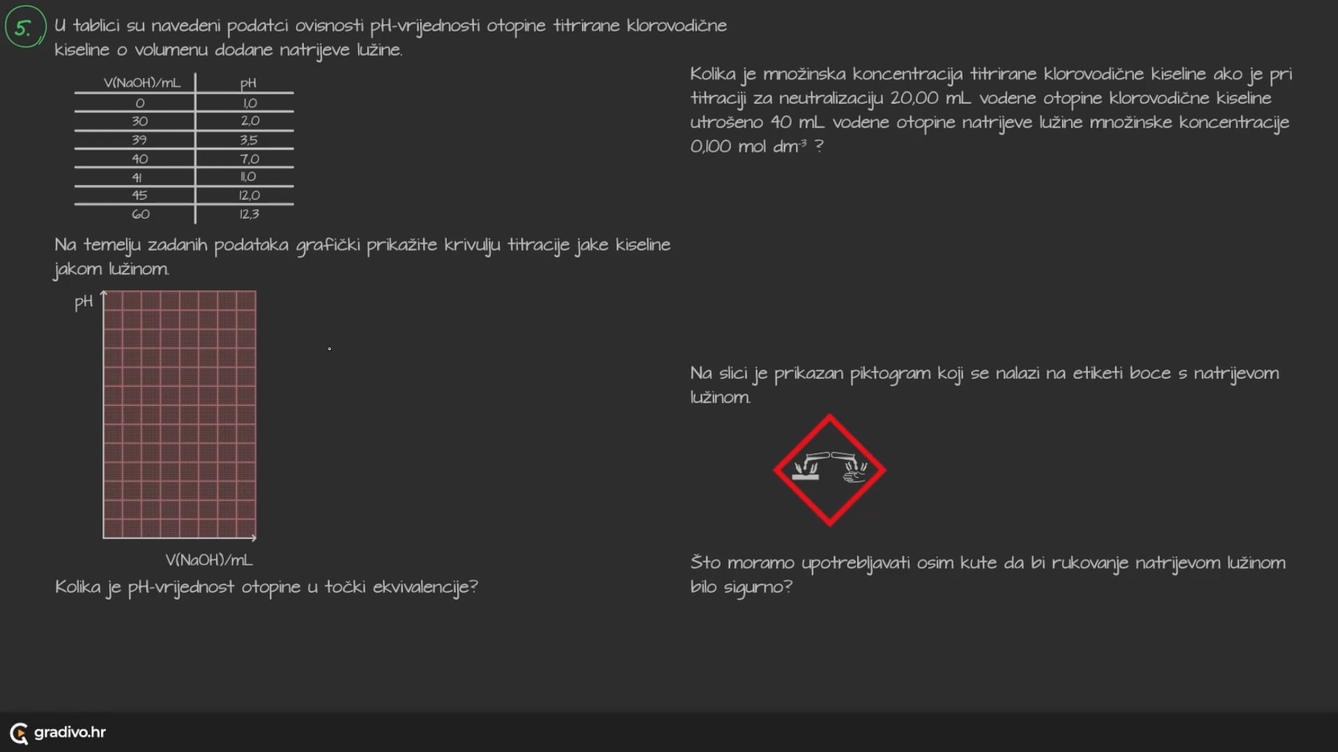 U tablici su navedeni podatci ovisnosti pH-vrijednosti otopine titrirane klorovodične kiseline o volumenu dodane natrijeve lužine.