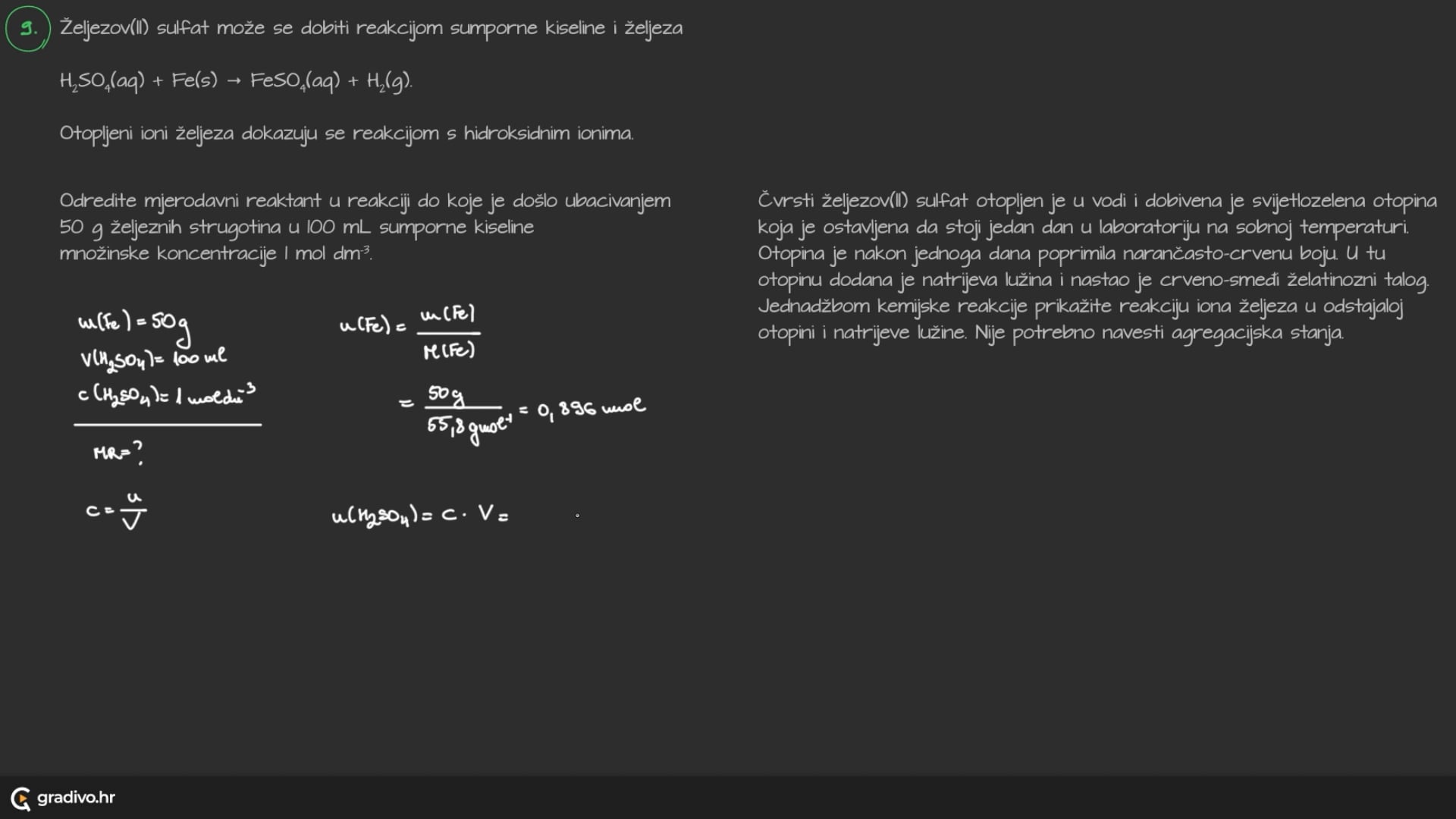 Odredite mjerodavni reaktant u reakciji do koje je došlo ubacivanjem 50 g željeznih strugotina u 100 mL sumporne kiseline množinske koncentracije 1moldm−3.