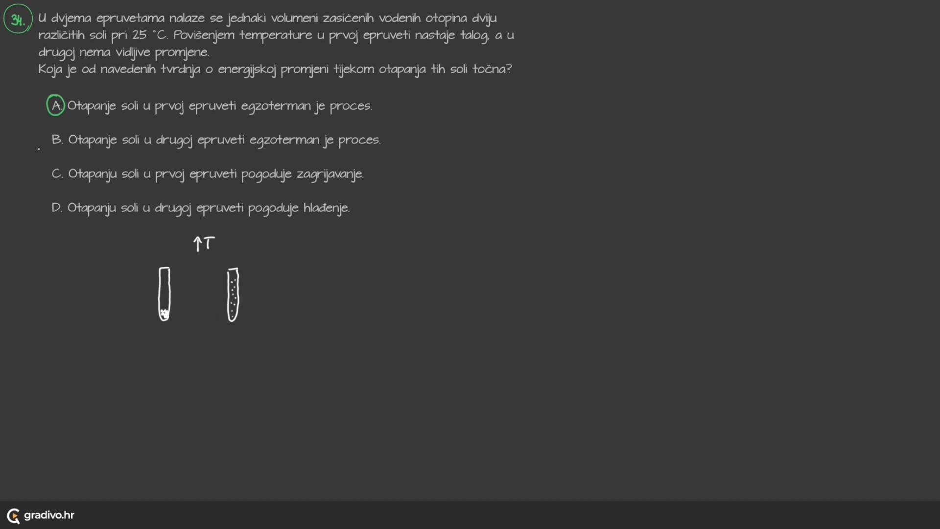 U dvjema epruvetama nalaze se jednaki volumeni zasićenih vodenih otopina dviju različitih soli pri 25 °C. Povišenjem temperature u prvoj epruveti nastaje talog, a u drugoj nema vidljive promjene. Koja je od navedenih tvrdnja o energijskoj promjeni tijekom otapanja tih soli točna?