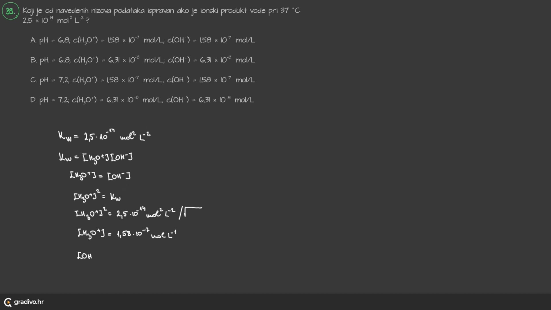D. $\mathrm{pH}=7,2 ; ~c\left(\mathrm{H}_{3} \mathrm{O}^{+}\right)=6,31 \times 10^{-8} \mathrm{~mol} / \mathrm{L}, ~c\left(\mathrm{OH}^{-}\right)=6,31 \times 10^{-8} \mathrm{~mol} / \mathrm{L}$