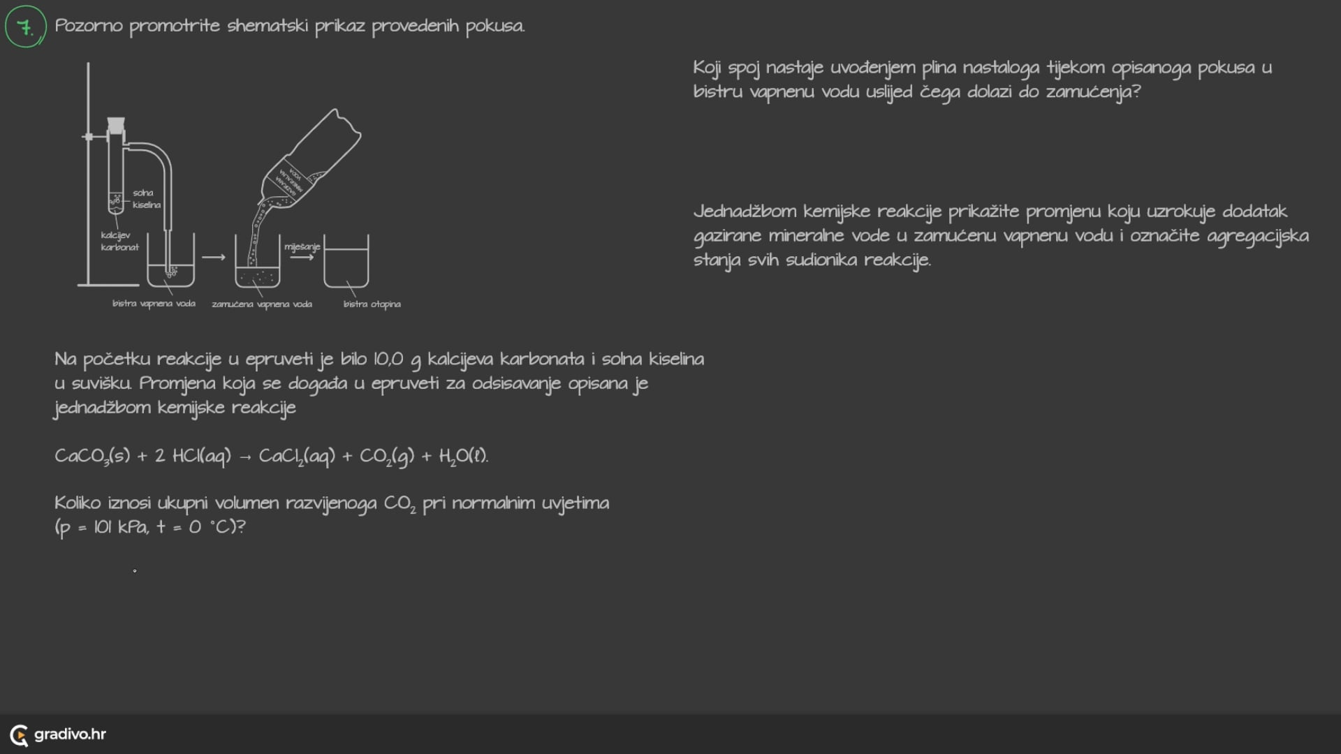 Na početku reakcije u epruveti je bilo 10,0 g kalcijeva karbonata i solna kiselina u suvišku. Promjena koja se događa u epruveti za odsisavanje opisana je jednadžbom kemijske reakcije
