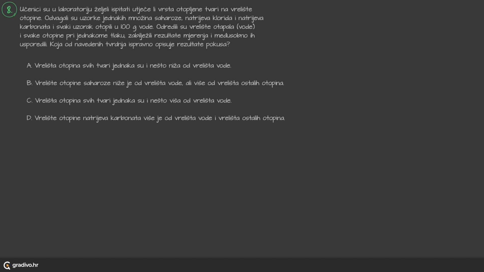 Učenici su u laboratoriju željeli ispitati utječe li vrsta otopljene tvari na vrelište otopine. Odvagali su uzorke jednakih množina saharoze, natrijeva klorida i natrijeva karbonata i svaki uzorak otopili u 100 g vode. Odredili su vrelište otapala (vode) i svake otopine pri jednakome tlaku, zabilježili rezultate mjerenja i međusobno ih usporedili. Koja od navedenih tvrdnja ispravno opisuje rezultate pokusa?
