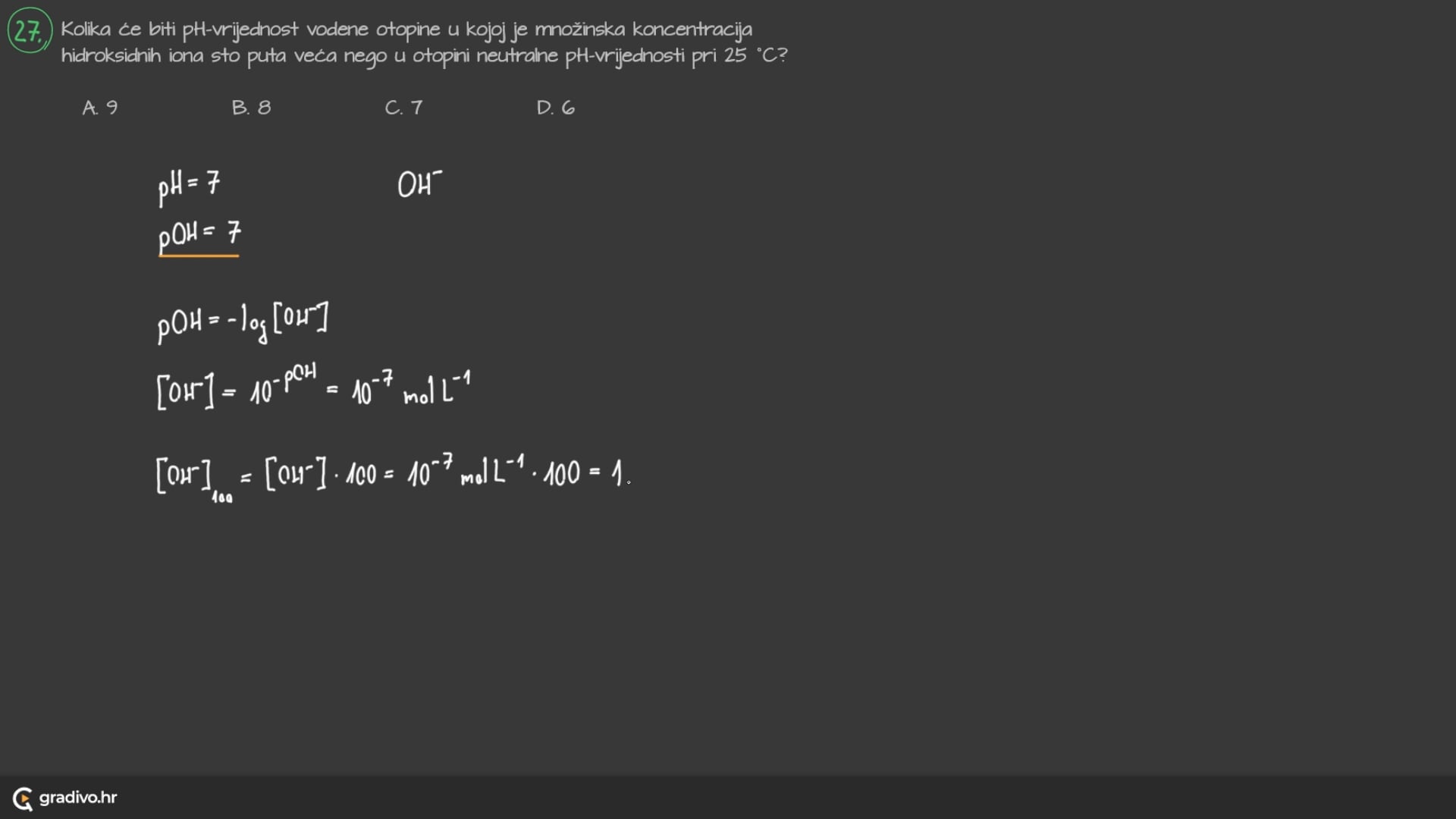 Kolika će biti pH-vrijednost vodene otopine u kojoj je množinska koncentracija hidroksidnih iona sto puta veća nego u otopini neutralne pH-vrijednosti pri 25 °C?