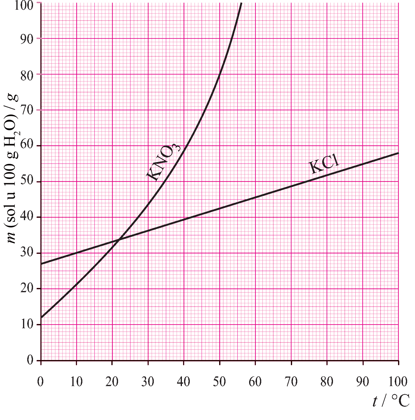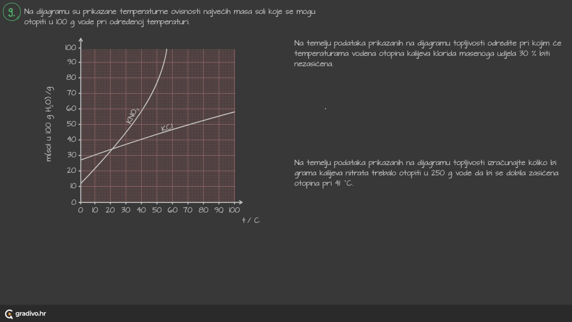 Na temelju podataka prikazanih na dijagramu topljivosti odredite pri kojim će temperaturama vodena otopina kalijeva klorida masenoga udjela 30 % biti nezasićena.