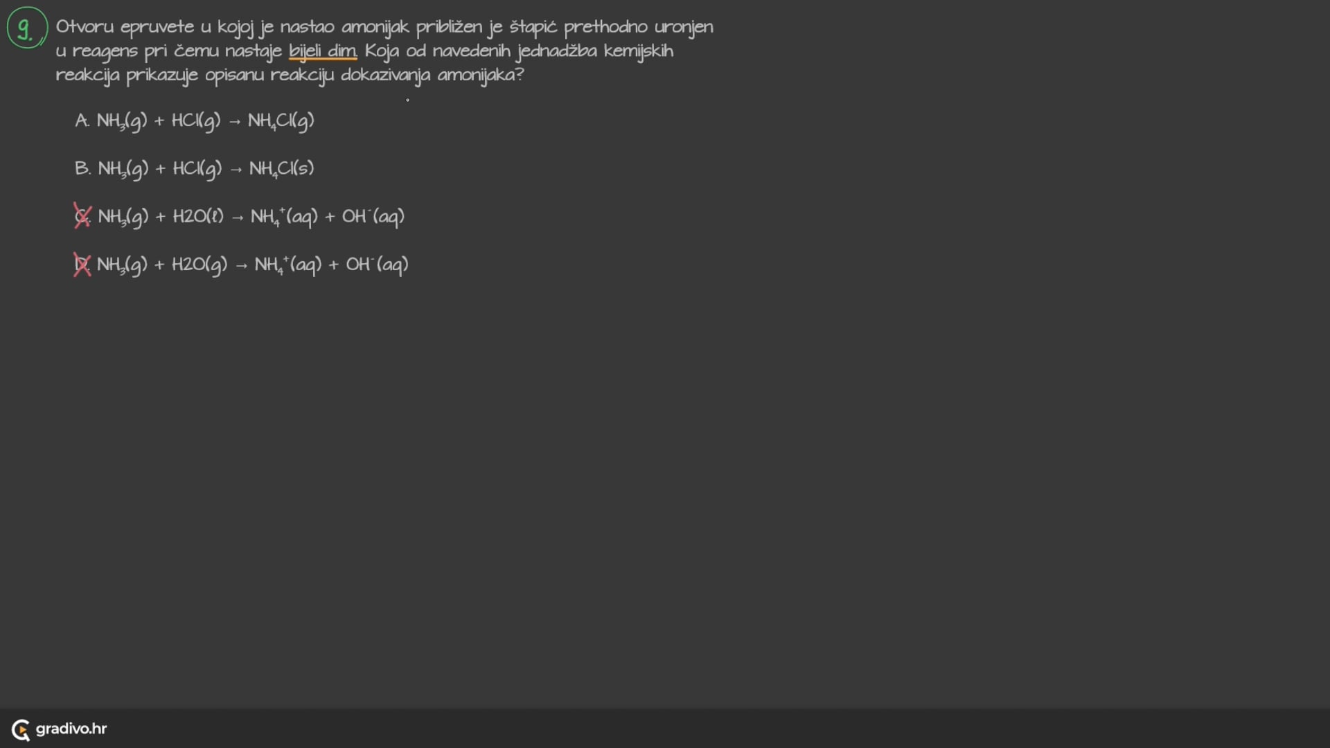 Otvoru epruvete u kojoj je nastao amonijak približen je štapić prethodno uronjen u reagens pri čemu nastaje bijeli dim. Koja od navedenih jednadžba kemijskih reakcija prikazuje opisanu reakciju dokazivanja amonijaka?