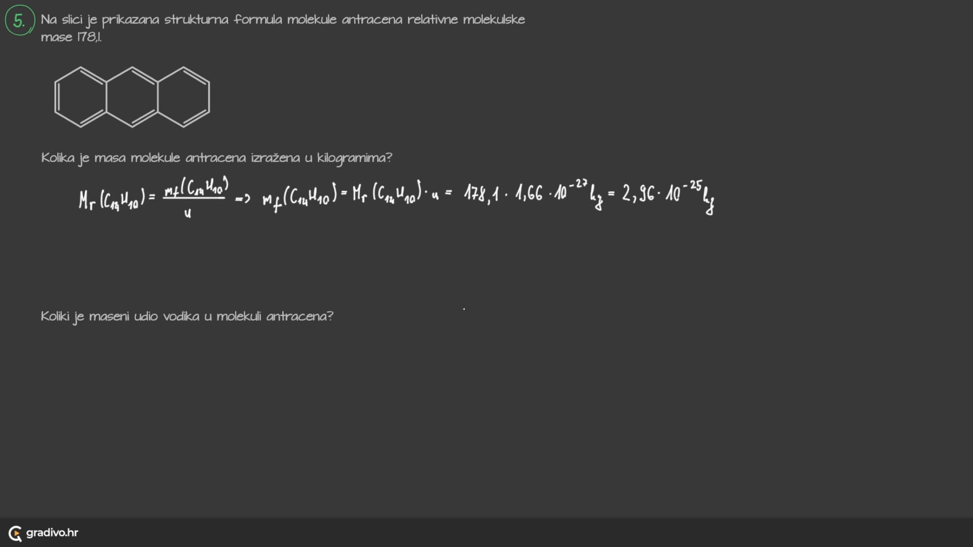 Na slici je prikazana strukturna formula molekule antracena relativne molekulske mase 178,1.