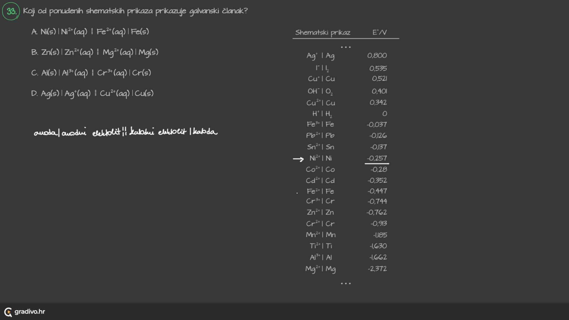 A. Ni(s)∣Ni2+(aq)\mathrm{Ni}(\mathrm{s}) \mid \mathrm{Ni}^{2+}(\mathrm{aq})Ni(s)∣Ni2+(aq) ¦¦ Fe2+(aq)∣Fe(s)\mathrm{Fe}^{2+}(\mathrm{aq}) \mid \mathrm{Fe}(\mathrm{s})Fe2+(aq)∣Fe(s)