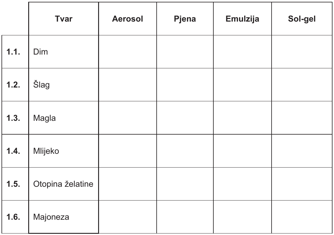 Nabrojene tvari razvrstajte na vrste koloidnih otopina: aerosol, pjena, emulzija i sol-gel. Obilježite znakom X vrstu koloidnih otopina kojoj pripada pojedina tvar.