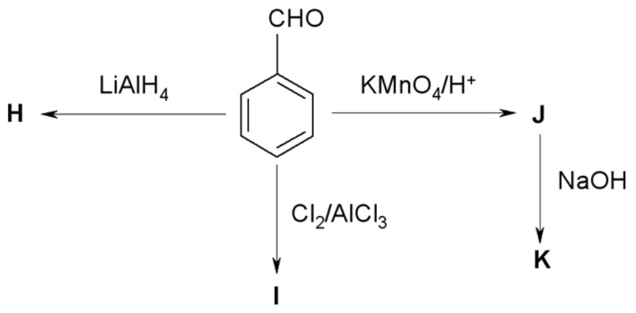 Proučite prikazanu reakcijsku shemu i odgovorite koje su tvari označene slovima H, I, J i K.