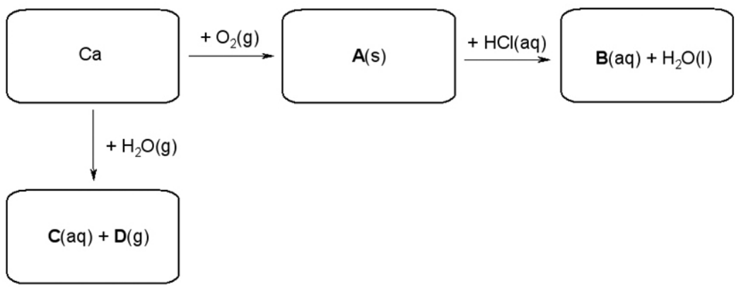 Proučite ponuđenu reakcijsku shemu i ispišite kemijske formule tvari označenih kao A(s), B(aq), C(aq) i D(g).