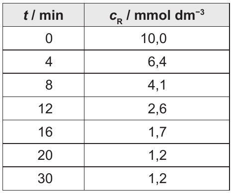 Za ravnotežnu kemijsku reakciju $\mathbf{R} \rightleftharpoons \mathbf{P}$ izmjerena je ovisnost koncentracije reaktan o vremenu kako je prikazano u tablici.
