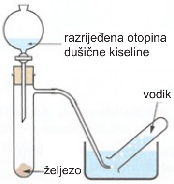 U reakciji vruće razrijeđene dušične kiseline i željeznih strugotina nastaju željezov(II) nitrat i vodik.