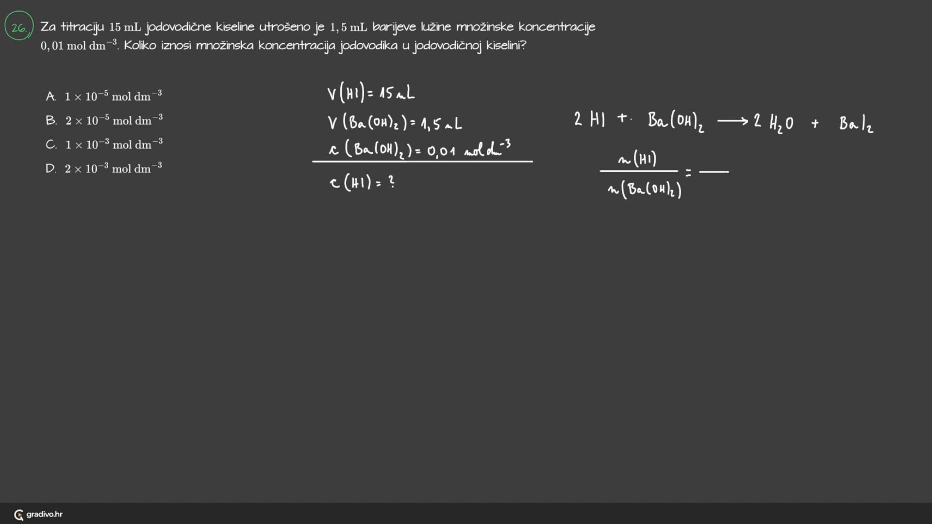 Za titraciju 15 mL jodovodične kiseline utrošeno je 1,5 mL barijeve lužine množinske koncentracije 0,01moldm−3. Koliko iznosi množinska koncentracija jodovodika u jodovodičnoj kiselini?