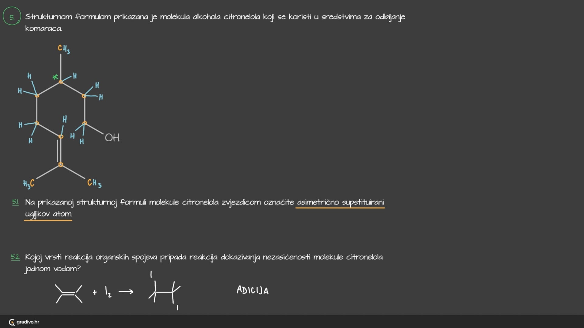Kojoj vrsti reakcija organskih spojeva pripada reakcija dokazivanja nezasićenosti molekule citronelola jodnom vodom?